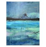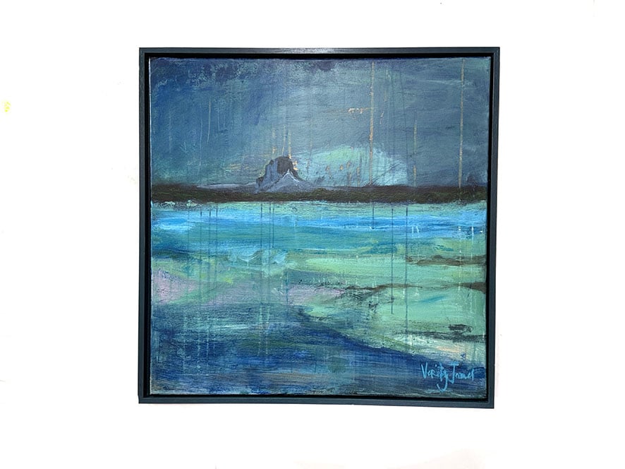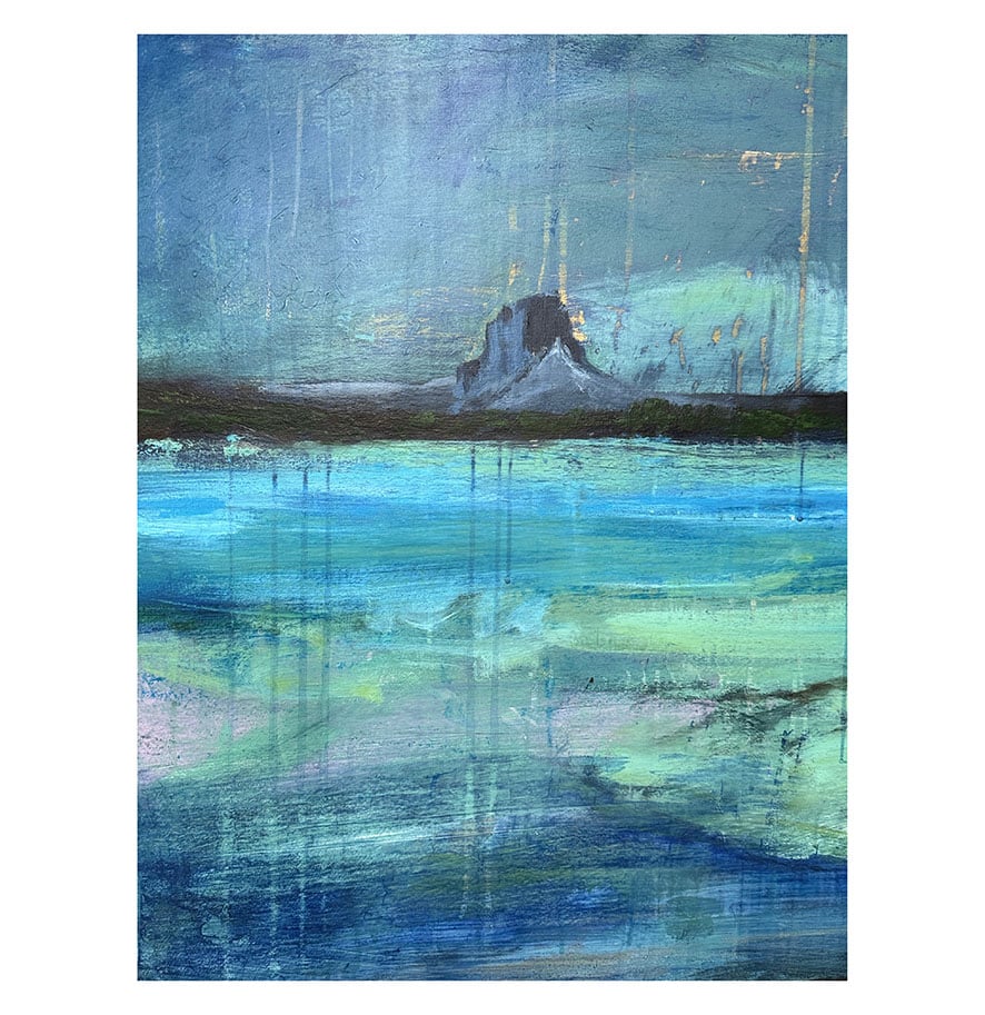 Painted from sketches made aboard the CalMac ferry from Mallaig, the work captures the ever-changing waters of the Inner Hebrides – layers of turquoise, deep blue, and jade green shifting with the light and tide.